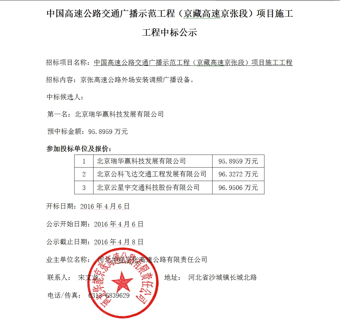 高速廣播工程中標(biāo)公示